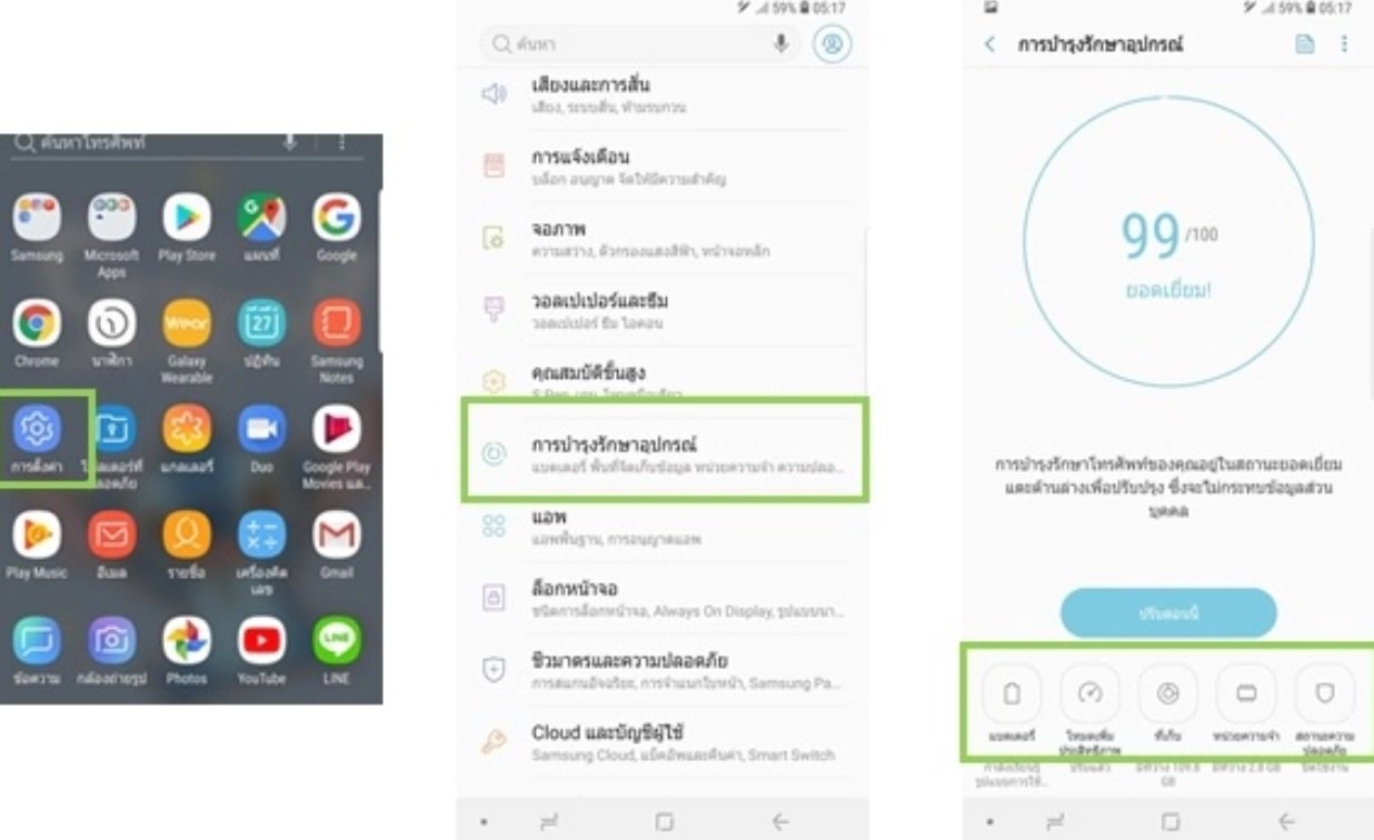 บนหน้าจอแอพส์ เลือก การตั้งค่า → การบำรุงรักษาอุปกรณ์