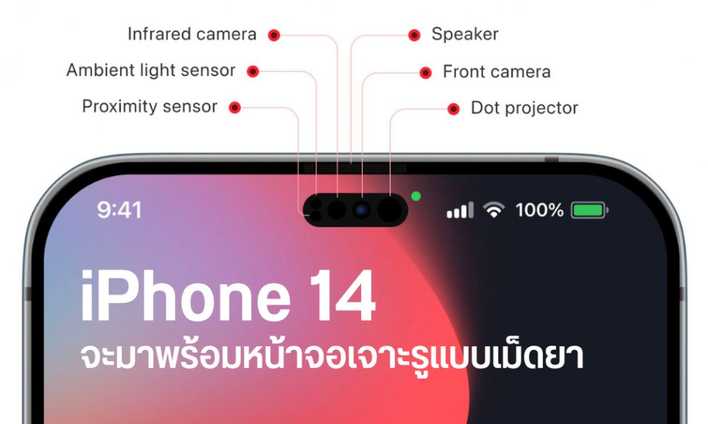 iPhone 14, iPhone 14 Max อาจยังใช้ดีไซน์รอยบากขนาดเล็กเหมือน iPhone 13 แต่ iPhone 14 Pro, iPhone 14 Pro Max มีข่าวลือว่าจะเปลี่ยนจากรอยบากเป็น “รูบนหน้าจอ” ส่วน Face ID นั้นจะซ่อนไว้ใต้จอแทน